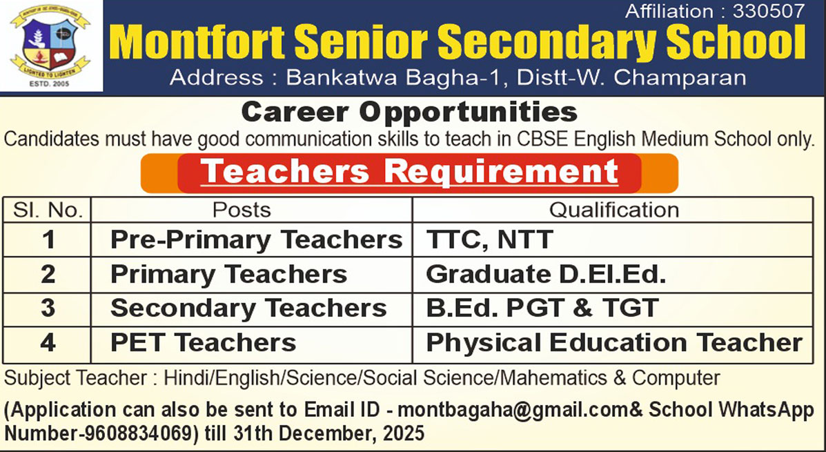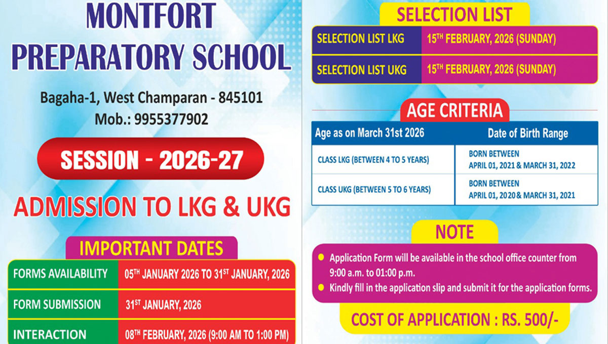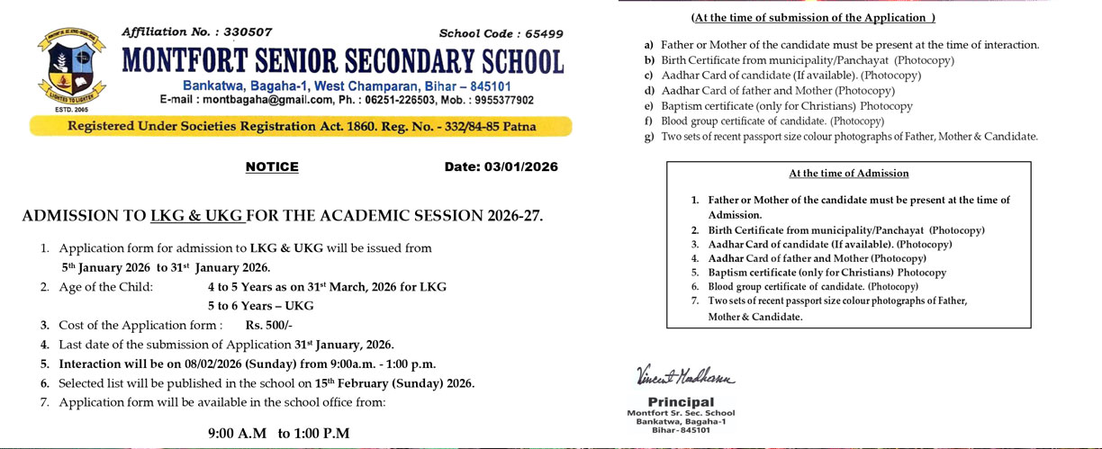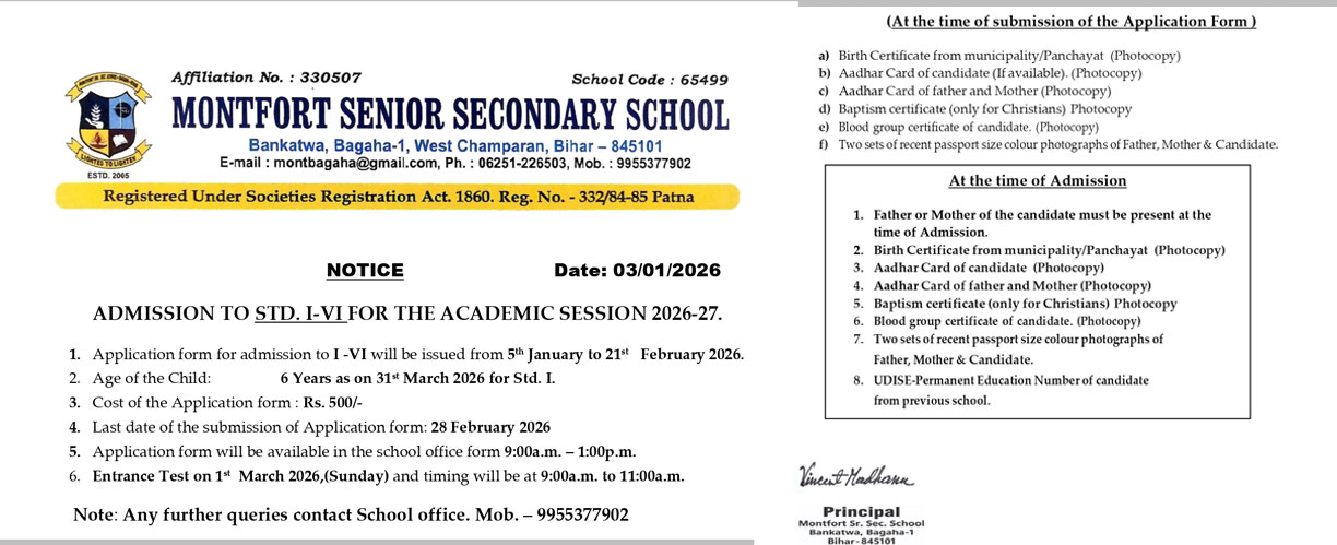 Montfort Senior Secondary School is a Christian religious minority institution founded in 2005. It is established and administered by the society of Montfort Brothers of St. Gabriel, Ranchi Province.